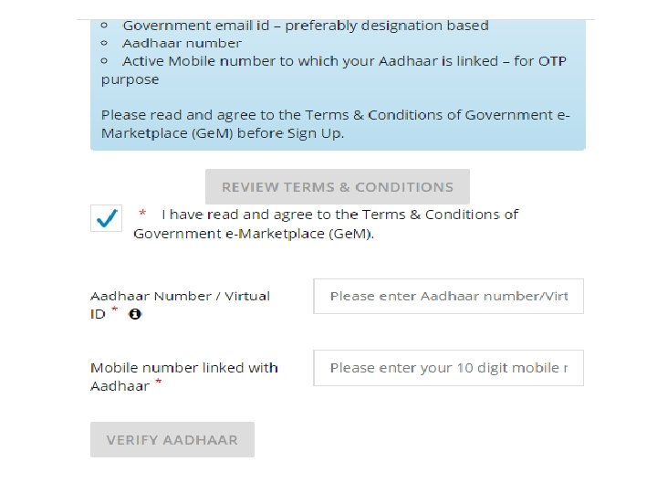 • Requirements to register on Gem Portal • User role to register on website is categorized as buyer and seller. A buyer which is a government organization needs to have Aadhaar number, official email id (gov. in/nic. in), official landline number and bank account details of an organization to register an organization on Ge. M portal. Below shown figure mention how to register in Ge. M as buyer