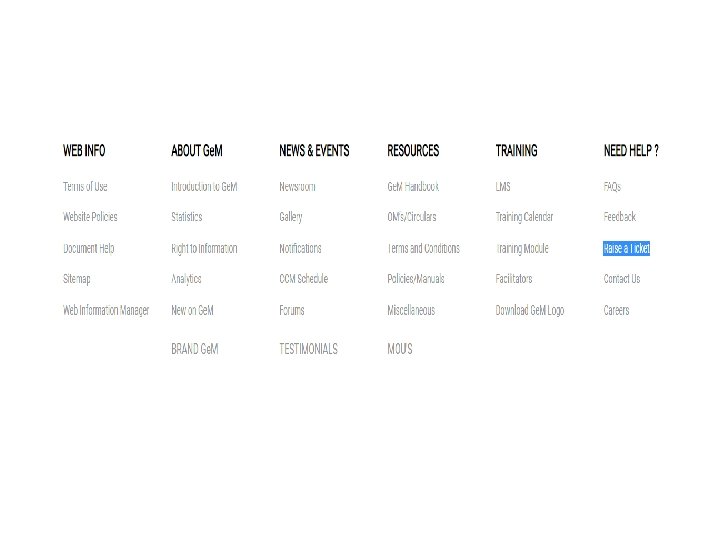 • Raising a Ticket • If any user faces any problem related to the Ge. M portal, then they can raise a ticket which have unique Id which can be tracked to check the status of the ticket whether the problem is resolved or not. Raise a Ticket option is available at the footer of Ge. M postal as shown in figure.