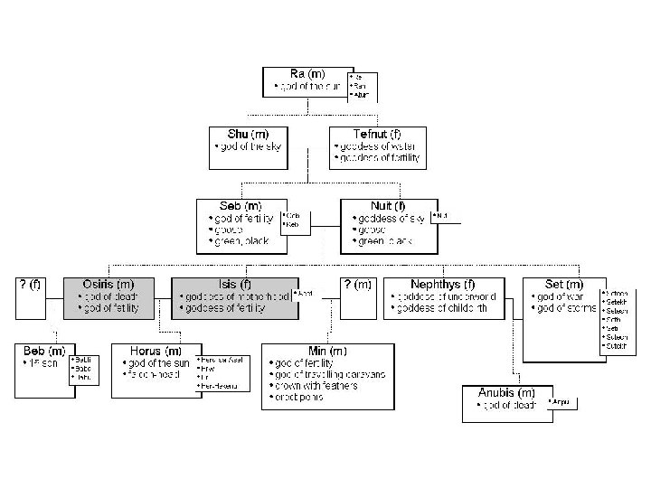 Egyptian Pantheon Anubis Re Hathor Atum Amun Osiris Isis Horus Theriomorphism: Manifestation of some aspect of the god’s power E. g. , Hathor as cow. Cow as symbol of fertility For more information, see http: //www. touregypt. net/godsofegypt/index. htm http: //www. nemo. nu/ibisportal/0 egyptintro/1 egypt/index. htm