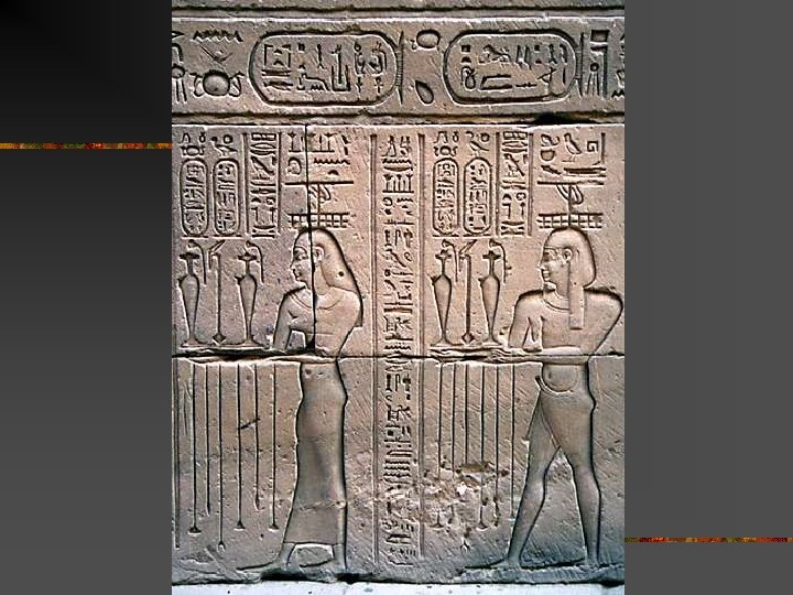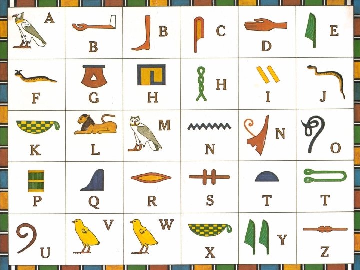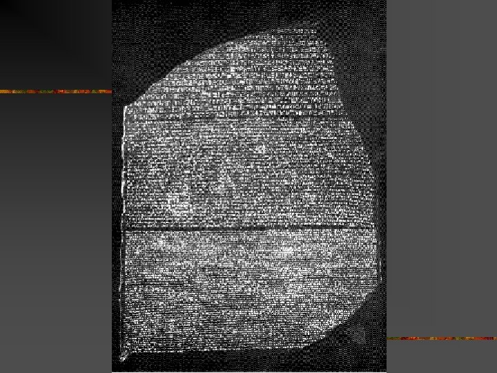 Egyptian Writing: Hieroglyphics Form of picture writing n Initially carved in stone or clay n Rosetta Stone – flat black stone with message in Hieroglyphics, Demotic, Greek