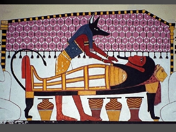 Mummification Process Preserved the ba (spirit) and ka (body) n Skilled workers labored for 70 days n Removed vital body organs – stored in canopic jars (heart remains) n Body then embalmed and wrapped n Pharaohs / officials buried in tombs n People buried in the sand n