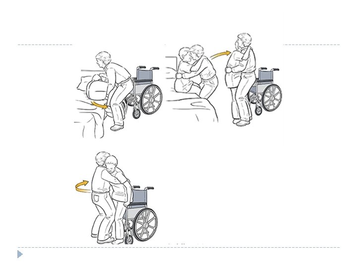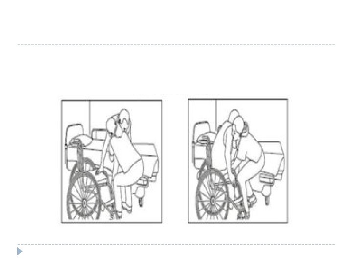 6. Tekerlerkli sandalye tranferleri � Tekerlekli sandalyeden birey kolları ile vücudunun ağırlığını alarak kendi başına transfer yapabileceği gibi kayma tahtası gibi aparatlar ile de transferini tek başına gerçekleştirebilir ya da resimde ki gibi söz konusu transfer esnasında bireye yardımcı olunabilir.
