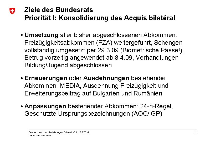 Ziele des Bundesrats Priorität I: Konsolidierung des Acquis bilatéral • Umsetzung aller bisher abgeschlossenen Abkommen: Freizügigkeitsabkommen (FZA) weitergeführt, Schengen vollständig umgesetzt per 29. 3. 09 (Biometrische Pässe!), Betrug vorzeitig angewendet ab 8. 4. 09, Verhandlungen Bildung/Jugend abgeschlossen • Erneuerungen oder Ausdehnungen bestehender Abkommen: MEDIA, Ausdehnung Freizügigkeit und Erweiterungsbeitrag auf Bulgarien und Rumänien • Anpassungen bestehender Abkommen: 24 -h-Regel, Geschützte Ursprungsbezeichnungen (AOC/IGP) Perspektiven der Beziehungen Schweiz-EU, 17. 3. 2010 Lukas Gresch-Brunner 17