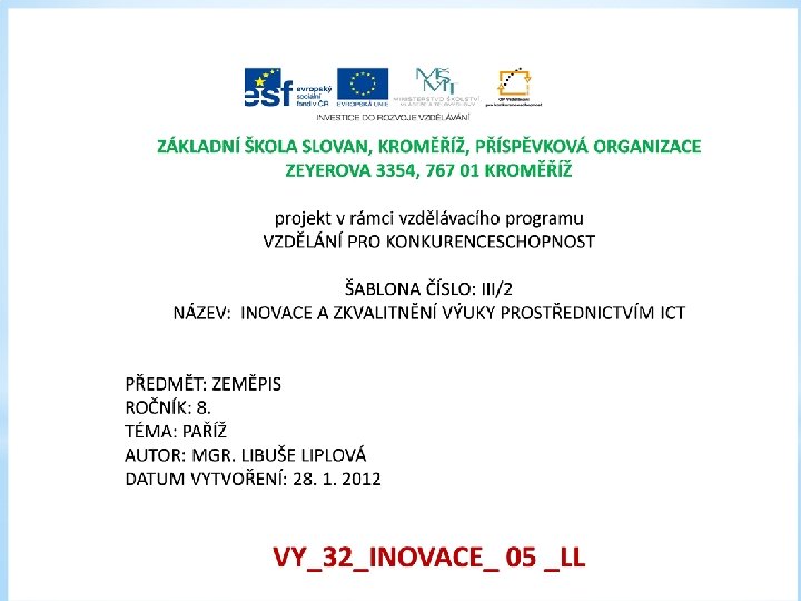 EIFFELOVA VĚŽ, LA DÉFENSE, MONTMARTRE, KATEDRALA SACRÉ – COEUR, KADERÁLE NOTRO-DAME f) PILOTÁŽ: tato práce pomohla žákům poznat hlavní město Francie. Pomocí obrazového materiálu se seznámili s historickými památkami Paříže a jejího okolí. Tato práce je doplňkový učební materiál. Zajímavé bylo pro žáky povídání o návštěvě města, které oživili svými poznatky a zážitky.