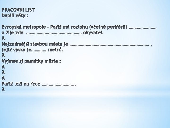 PRACOVNÍ LIST ŘEŠENÍ Doplň věty : Evropská metropole - Paříž má rozlohu (včetně periférií) 1 800 km 2 a žije zde 10 milionů obyvatel. Nejznámější stavbou města je EIFFELOVA VĚŽ, jejíž výška je 324 metrů. Vyjmenuj památky města : KATEDRALA SACRÉ – COEUR, KATEDRÁLA NOTRE – DAME, VÍTĚZNÝ OBLOUK, LOUVRE Paříž leží na řece Seina.
