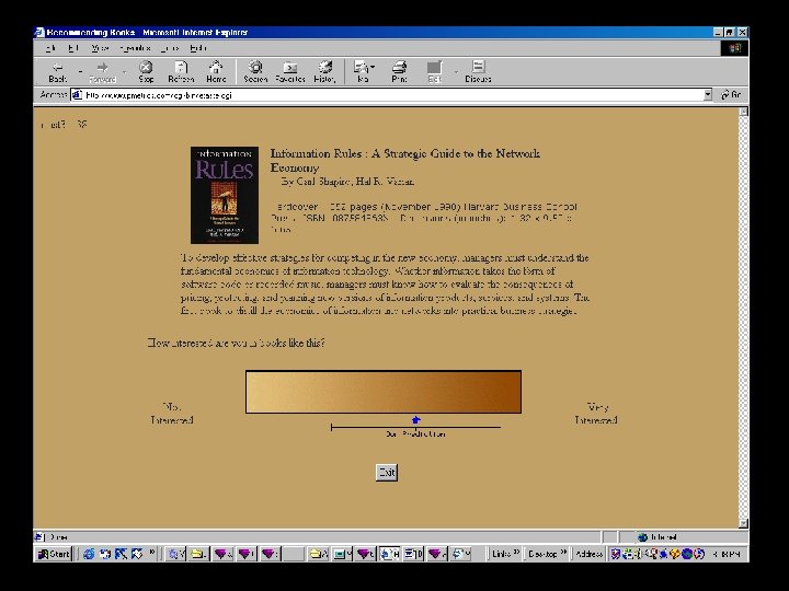 Some Previous Work • D. Goldberg, et al. - Tapestry (1992) • Riedel, Resnick, Konstan et. al. Group. Lens(1994 -) • Shardanand Maes - Ringo (1995) • Resnick and Varian (1997) • Breese et. al. at Microsoft Research (1998) • Pazzani (1999) • Herlocker et. al. - Group. Lens (1999)