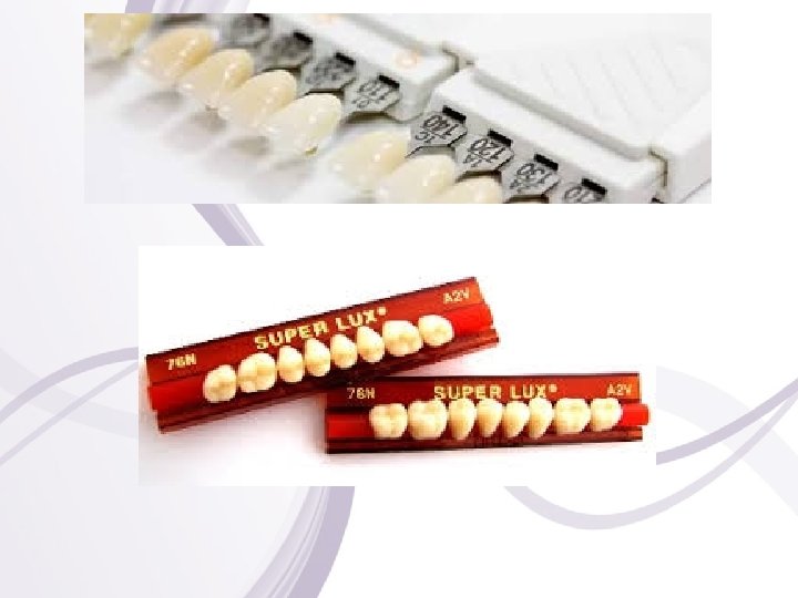 Dintii din rasini acrilice Din 1935, de cand firma KULZER a depus documentatia si a obtinut un brevet pentru un procedeu usor de tratare a rasinii sintetice, si pana in prezent, structura si calitatea rasinilor acrilice si implicit a dintilor artificiali din acrilat au suferit modificari importante. Dintii artificiali acrilici se pot confectiona atat manufactural, cat si industrial. a) Fabricati in conditiile industriei chimice moderne, rasina acrilica este introdusa in stante metalice, fenomenul chimic de polimerizare se desfasoara la presiuni de 8 -10 da. N/cm 3 si la temperaturi de 200 -250°C. Dintii fabricati sunt caracterizati de o structura densa, omogena, ceea ce le confera rezistenta mecanica, nu se abrazeaza; suprafete lucioase, stabilitate coloristica in timp; neimpregnare cu resturi alimentare si flora microbiana. Sunt comercializati sub forma de garnituri, asezati in ceara plastica, pe placute pentru grupul frontal si lateral. Pe placuta fiecarei garnituri sunt scrise : marca fabricii, culoarea, dimensiunea si forma.