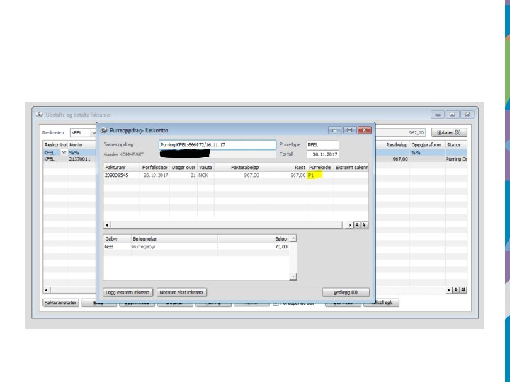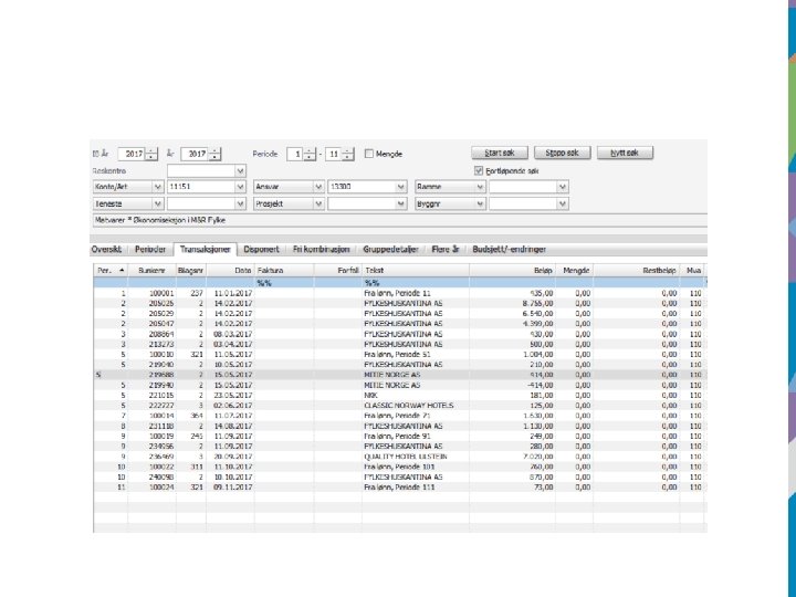 Purre- og inkassoutgifter • Vi skal nå få frem av regnskapet hvor mye vi betaler i purre- og inkassoutgifter. • Bokføres slik: • Art 11954 Purregebyr og inkassoutgifter • Art 15002 Morarente • Fakturaene må da splittes slik at purre, rente og inkassoutgifter kommer på riktig art.