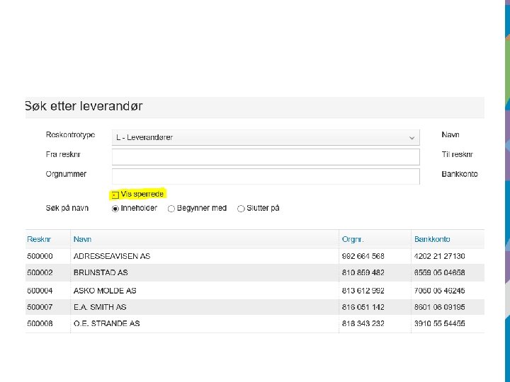 Minner om…. • Fakturering til kommunal barnehage/skole skal faktura merkes med skolens navn i feltet kontaktinformasjon eller oppgis i feltet fritekst. • Fortsatt mange duplikater i vårt kunderegister. Gi beskjed dersom dere finner flere kunder med samme navn slik at disse blir sperret.