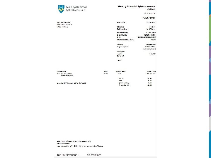 Inngående faktura • Vi vil ha EHF faktura stilet til: Møre og Romsdal fylkeskommune Postboks 2501 6404 Molde EHF til: 944183779 Merkes f. eks. : 20500 i «deres ref» feltet på fakturaen. Kun ansvarsnummer, ikke navn etc. i tillegg.