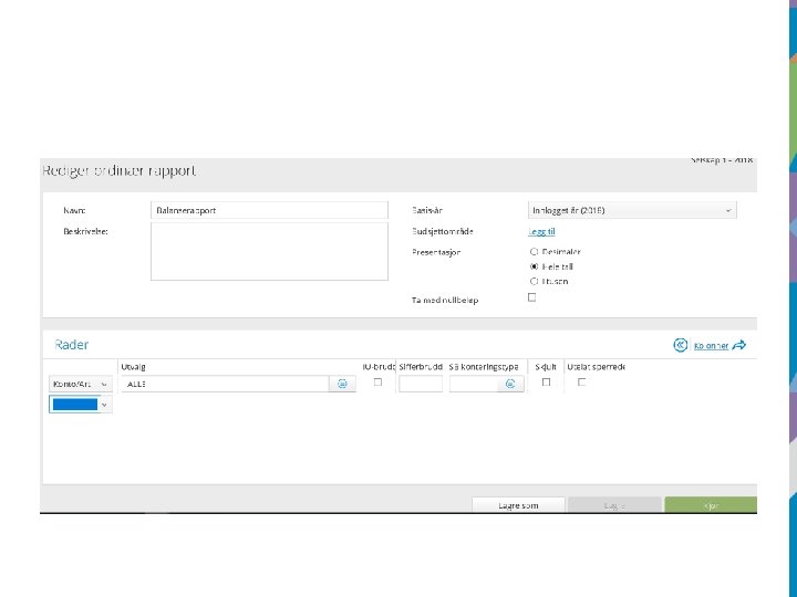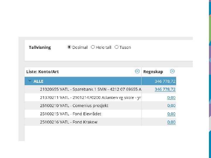Årsavslutning • Avsetning til fond/bruk av fond • Husk fakturabehandling i Web • Anordningsprinsippet – Leveringstidspunktet – Anslagsposteringer – Periodiseringsbilag/tilbakeføring periodisering • Lønn – følg fristene – Gir mer korrekt regnskap uten ekstra periodiseringsregnskap