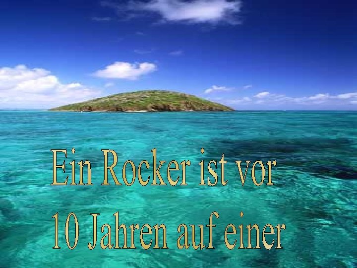 Die Taucherin fragt ihn: "Wann hast du zuletzt einen Schluck Alkohol getrunken? " Der Rocker: "Vor 10 Jahren, bevor ich hier gestrandet bin. " Die Taucherin greift in eine anderen Tasche an ihrem Taucheranzug, holt einen Flachmann heraus und gibt ihn dem Rocker. Dieser nimmt einen kräftigen Schluck und meint: "Aaahh, tut das gut. "