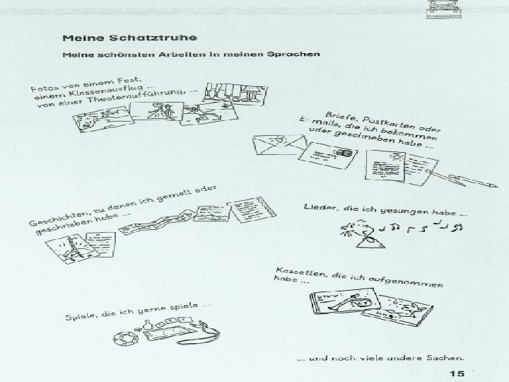 Portfolio • eine Mappe, die als Lernbiographie dient. Der Schüler legt dort alles ab, was er im Unterricht erstellt hat. Das Ziel ist, dass er seine Lernerfolge besser nachvollziehen und bewerten kann (Rieke Decker) • ESP Europäisches Sprachenportfolio. Informationsinstrument zur Dokumentation und Präsentation von Kenntnissen, schulisch oder außerschulisch erworbenen Sprachen sowie von interkulturellen Erfahrungen (Liliane Klein)