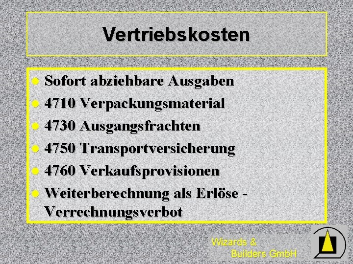 Vertriebskosten Sofort abziehbare Ausgaben l 4710 Verpackungsmaterial l 4730 Ausgangsfrachten l 4750 Transportversicherung l 4760 Verkaufsprovisionen l Weiterberechnung als Erlöse Verrechnungsverbot l Wizards & Builders Gmb. H
