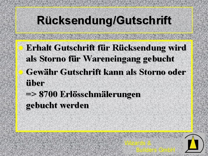 Rücksendung/Gutschrift Erhalt Gutschrift für Rücksendung wird als Storno für Wareneingang gebucht l Gewähr Gutschrift kann als Storno oder über => 8700 Erlösschmälerungen gebucht werden l Wizards & Builders Gmb. H