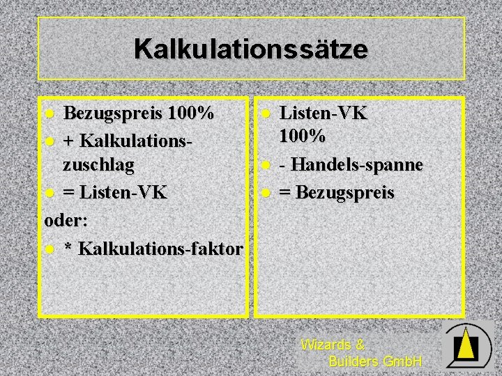 Kalkulationssätze Bezugspreis 100% l + Kalkulationszuschlag l = Listen-VK oder: l * Kalkulations-faktor l l Listen-VK 100% - Handels-spanne = Bezugspreis Wizards & Builders Gmb. H