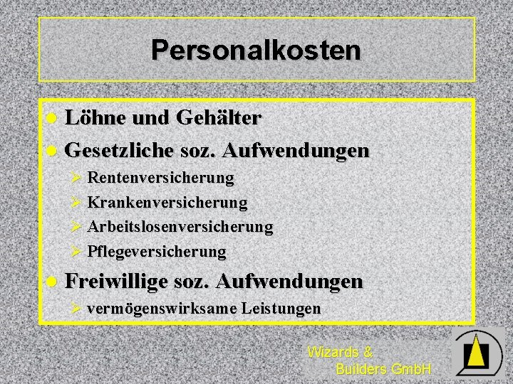 Personalkosten Löhne und Gehälter l Gesetzliche soz. Aufwendungen l Ø Rentenversicherung Ø Krankenversicherung Ø Arbeitslosenversicherung Ø Pflegeversicherung l Freiwillige soz. Aufwendungen Ø vermögenswirksame Leistungen Wizards & Builders Gmb. H