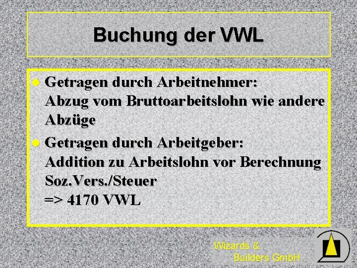 Buchung der VWL Getragen durch Arbeitnehmer: Abzug vom Bruttoarbeitslohn wie andere Abzüge l Getragen durch Arbeitgeber: Addition zu Arbeitslohn vor Berechnung Soz. Vers. /Steuer => 4170 VWL l Wizards & Builders Gmb. H