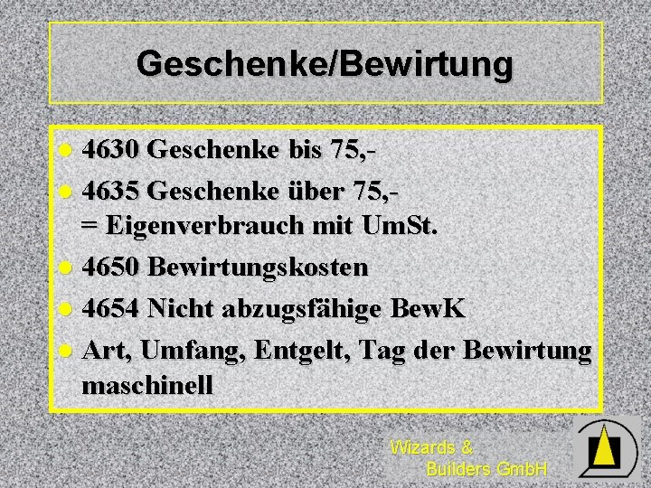 Geschenke/Bewirtung 4630 Geschenke bis 75, l 4635 Geschenke über 75, = Eigenverbrauch mit Um. St. l 4650 Bewirtungskosten l 4654 Nicht abzugsfähige Bew. K l Art, Umfang, Entgelt, Tag der Bewirtung maschinell l Wizards & Builders Gmb. H