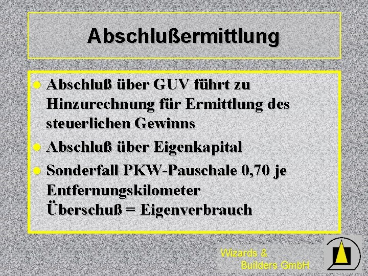 Abschlußermittlung Abschluß über GUV führt zu Hinzurechnung für Ermittlung des steuerlichen Gewinns l Abschluß über Eigenkapital l Sonderfall PKW-Pauschale 0, 70 je Entfernungskilometer Überschuß = Eigenverbrauch l Wizards & Builders Gmb. H
