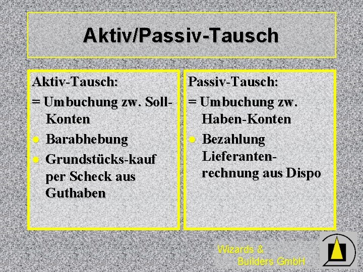 Aktiv/Passiv-Tausch Aktiv-Tausch: = Umbuchung zw. Soll. Konten l Barabhebung l Grundstücks-kauf per Scheck aus Guthaben Passiv-Tausch: = Umbuchung zw. Haben-Konten l Bezahlung Lieferantenrechnung aus Dispo Wizards & Builders Gmb. H