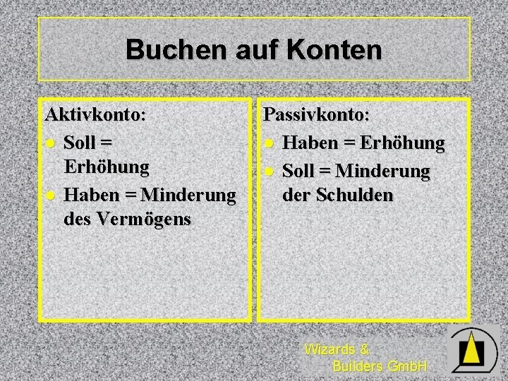 Buchen auf Konten Aktivkonto: l Soll = Erhöhung l Haben = Minderung des Vermögens Passivkonto: l Haben = Erhöhung l Soll = Minderung der Schulden Wizards & Builders Gmb. H