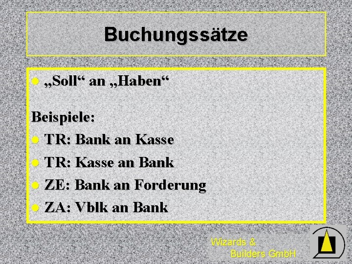 Buchungssätze l „Soll“ an „Haben“ Beispiele: l TR: Bank an Kasse l TR: Kasse an Bank l ZE: Bank an Forderung l ZA: Vblk an Bank Wizards & Builders Gmb. H