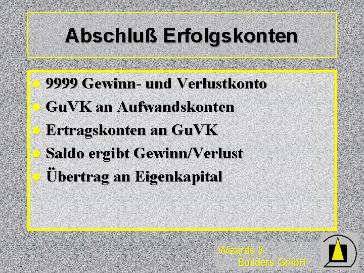 Abschluß Erfolgskonten 9999 Gewinn- und Verlustkonto l Gu. VK an Aufwandskonten l Ertragskonten an Gu. VK l Saldo ergibt Gewinn/Verlust l Übertrag an Eigenkapital l Wizards & Builders Gmb. H
