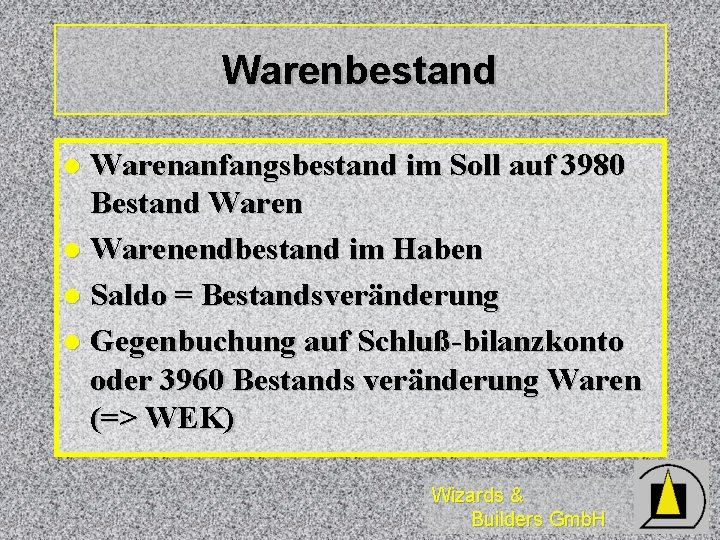 Warenbestand Warenanfangsbestand im Soll auf 3980 Bestand Waren l Warenendbestand im Haben l Saldo = Bestandsveränderung l Gegenbuchung auf Schluß-bilanzkonto oder 3960 Bestands veränderung Waren (=> WEK) l Wizards & Builders Gmb. H