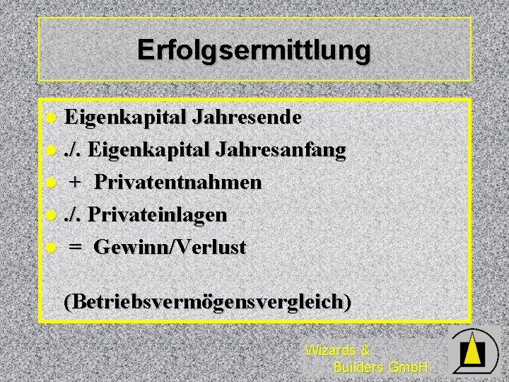 Erfolgsermittlung Eigenkapital Jahresende l. /. Eigenkapital Jahresanfang l + Privatentnahmen l. /. Privateinlagen l = Gewinn/Verlust l (Betriebsvermögensvergleich) Wizards & Builders Gmb. H