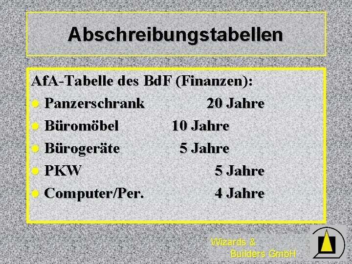 Abschreibungstabellen Af. A-Tabelle des Bd. F (Finanzen): l Panzerschrank 20 Jahre l Büromöbel 10 Jahre l Bürogeräte 5 Jahre l PKW 5 Jahre l Computer/Per. 4 Jahre Wizards & Builders Gmb. H