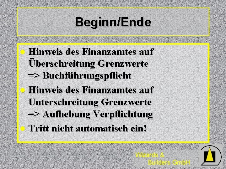Beginn/Ende Hinweis des Finanzamtes auf Überschreitung Grenzwerte => Buchführungspflicht l Hinweis des Finanzamtes auf Unterschreitung Grenzwerte => Aufhebung Verpflichtung l Tritt nicht automatisch ein! l Wizards & Builders Gmb. H