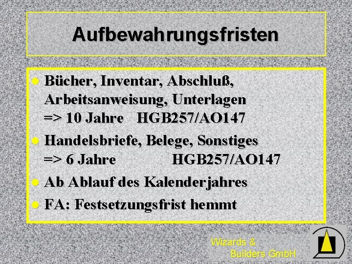 Aufbewahrungsfristen Bücher, Inventar, Abschluß, Arbeitsanweisung, Unterlagen => 10 Jahre HGB 257/AO 147 l Handelsbriefe, Belege, Sonstiges => 6 Jahre HGB 257/AO 147 l Ab Ablauf des Kalenderjahres l FA: Festsetzungsfrist hemmt l Wizards & Builders Gmb. H