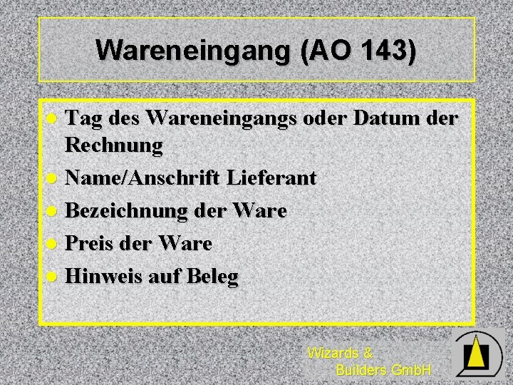 Wareneingang (AO 143) Tag des Wareneingangs oder Datum der Rechnung l Name/Anschrift Lieferant l Bezeichnung der Ware l Preis der Ware l Hinweis auf Beleg l Wizards & Builders Gmb. H