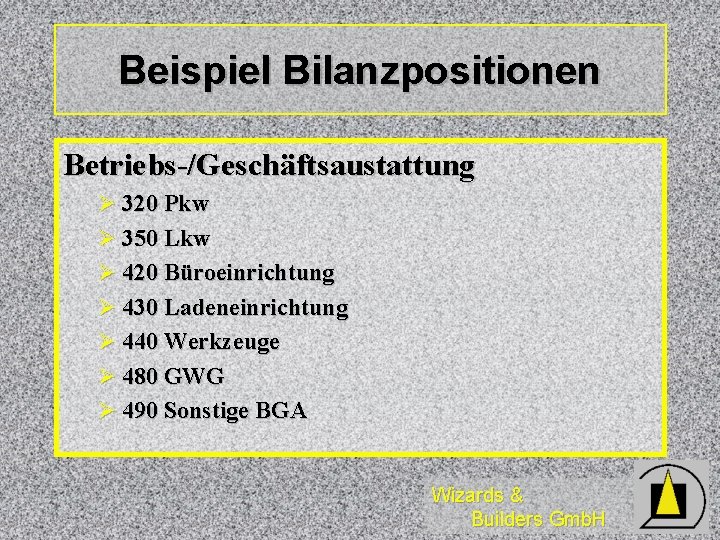 Beispiel Bilanzpositionen Betriebs-/Geschäftsaustattung Ø 320 Pkw Ø 350 Lkw Ø 420 Büroeinrichtung Ø 430 Ladeneinrichtung Ø 440 Werkzeuge Ø 480 GWG Ø 490 Sonstige BGA Wizards & Builders Gmb. H