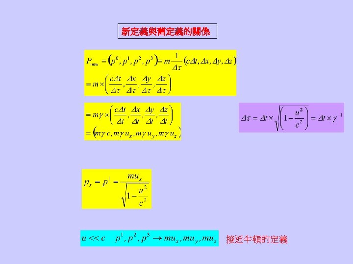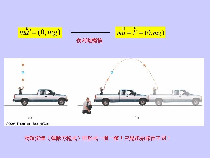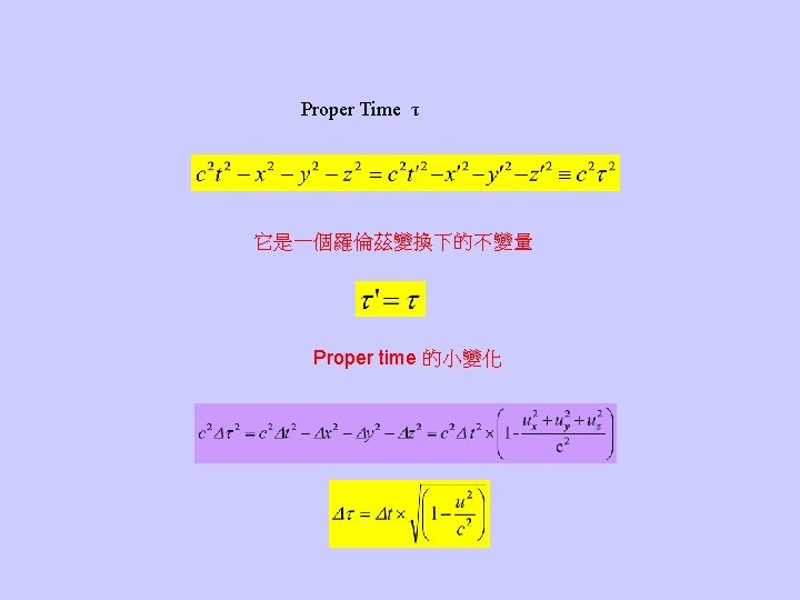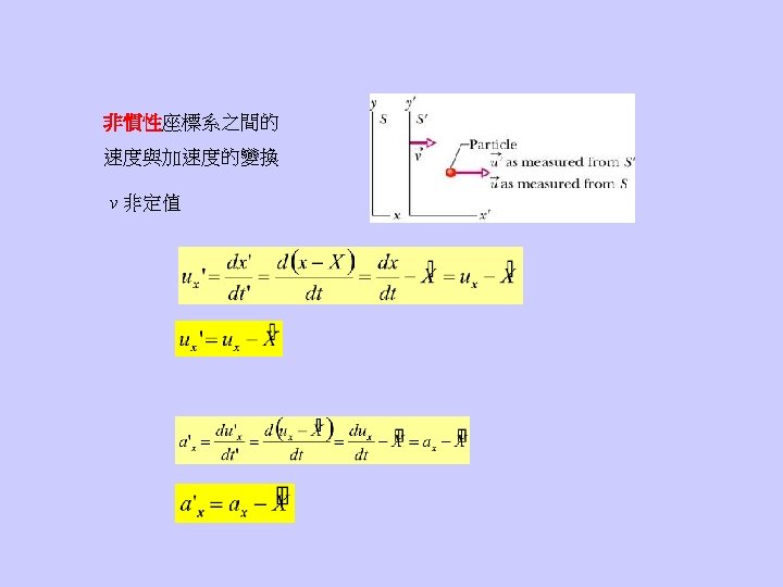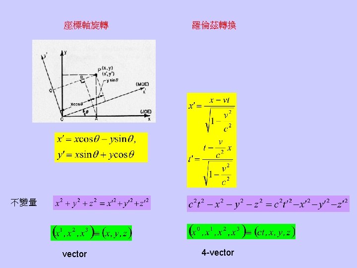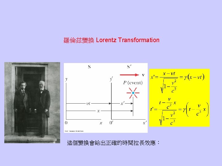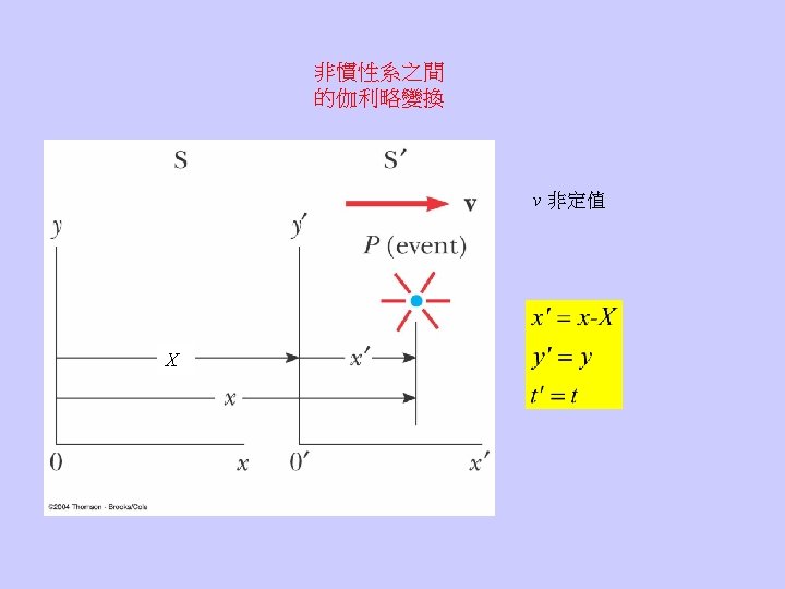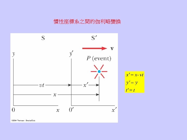 • The speed of light is always the same no matter how the observer moves. Maxwell方程式在不同的慣性座標系中,型式不變。 伽利略變換必須修正
