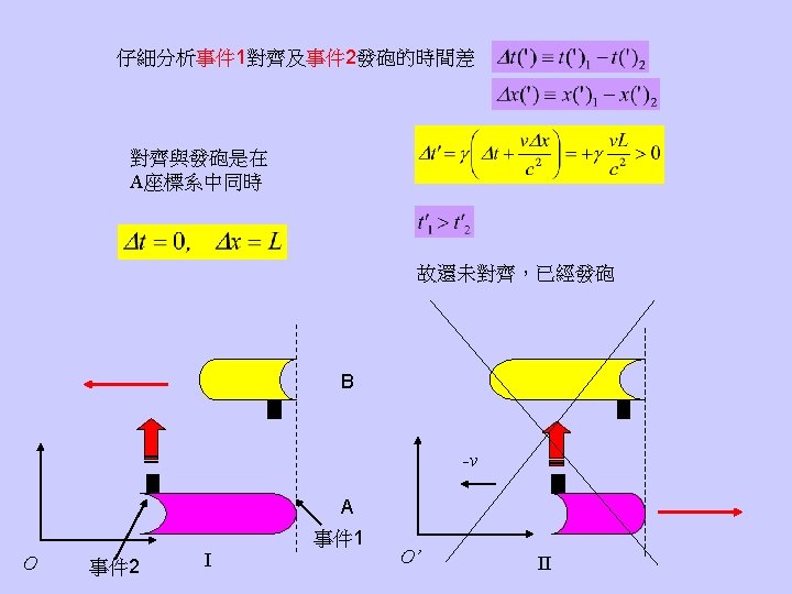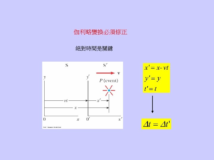伽利略變換錯在哪裡? It was Einstein who first realized how the constant light speed implies a total revolution of our concept of time Relativity of simultaneity The two explosions are simultaneous for Sam but not simultaneous for Sally!!!!! Time is no smooth river.