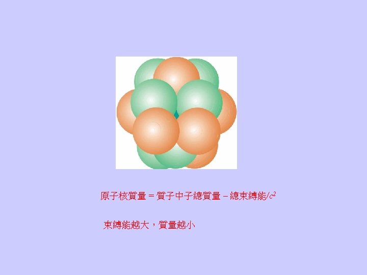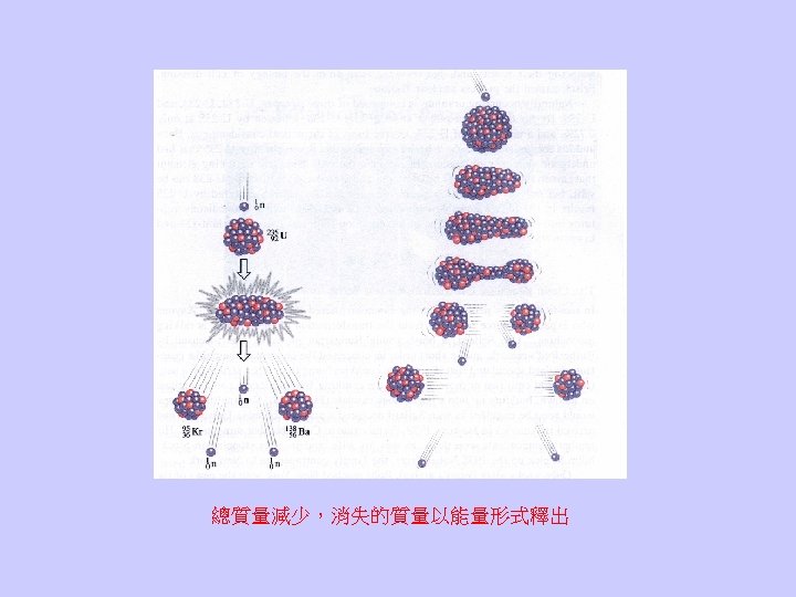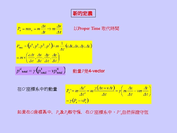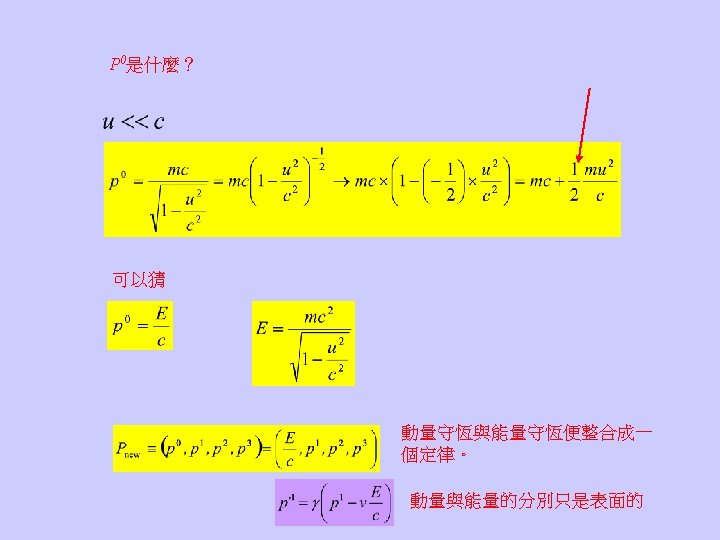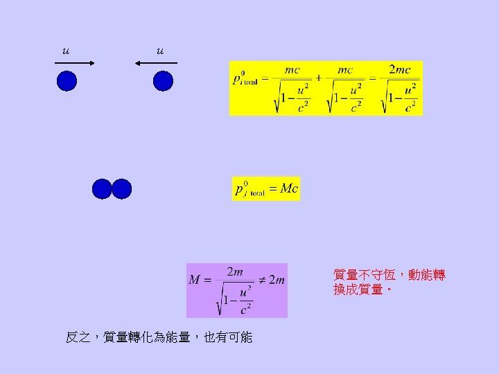 Even at rest, an object still contain an energy due to its mass: It opens up the possibility to convert mass into energy or vice versa. 質量是能量的一種形式,能量守恆蘊含質量可以轉換為其他形式的能量,其 他形式的能量亦可轉換為質量,質量不再守恆。