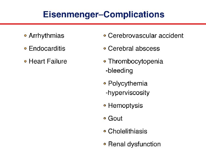 Eisenmenger Syndrome Natural History Life expectancy reduced by about 20 years Survival Pattern: At one year 97% At 5 years 87% At 10 years 80% At 15 years 77% At 25 years 42% In IPAH 3 YR SURVIVAL < 20 – 30%