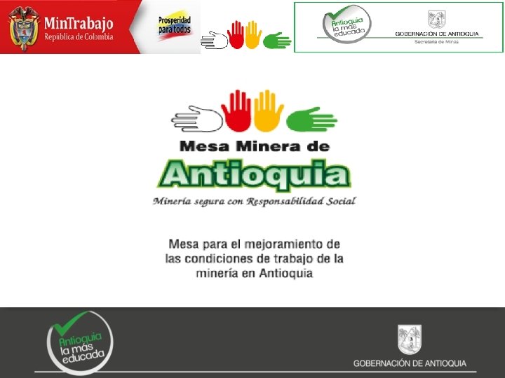 LANZAMIENTO DE LA MESA MINERA El lanzamiento de la Mesa Minera del departamento de Antioquia se realizó el 4 de Mayo del 2010, en la Gobernación de Antioquia, con la presencia del Ministerio de Minas y Energía, Ministerio de Relaciones Laborales, Gobernador de Antioquia, Secretaría de Minas, Ministerio de Trabajo Territorial Antioquia, Servicio Geológico Colombiano, Representante de Empresarios, Representantes los de Trabajadores, ARL´S y Procuraduría.