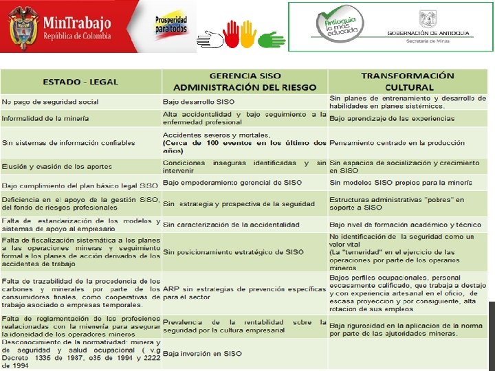 AVANCES 1. Estadística del Sector Minero en el departamento de Antioquia en el tema de SISO. 2. Hoja de ruta para iniciar Plan de Choque dirigido a los sectores con mayor vulnerabilidad. 3. Participación en las Ferias Mineras en los Municipios de Segovia y El Bagre. 4. Participación en el Proyecto Mejoramiento de Productividad Consorcio Sinifaná. 5. Envío de Proyecto de la Mesa Minera a nivel central- Presidencia República - Ministerio de Minas y Energía - Ministerio de Trabajo. 6. Participación en el V Edición del Congreso Prevención de Riesgos Profesionales Laborales de Iberoamérica – Cartagena Julio del 2011. 7. Visitas de carácter preventivo a las subregiones- Magdalena Medio, Suroeste (Cuenca de la Sinifaná) Nordeste por la comisión técnica : MINISTERIO – SENA - SECRETARíA MINAS, ACOPI, ARL. S