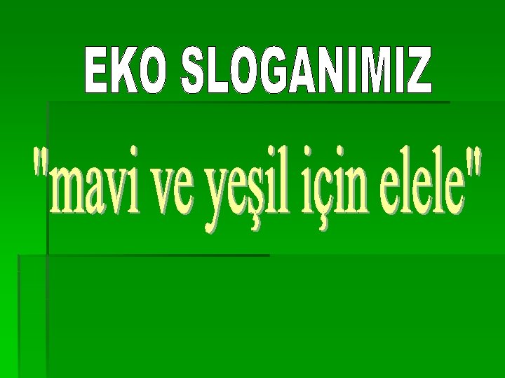 İÇERİK § § § § Eko okul projesi nedir? Eko okul projesi nasıl yürütülür? Temsilci öğretmen ve öğrencilerimiz kimlerdir? Eko sloganımız nedir? Eylem planımız 1. dönem yapılan çalışmalardan örnekler Birlikte Neler Yapmalıyız?