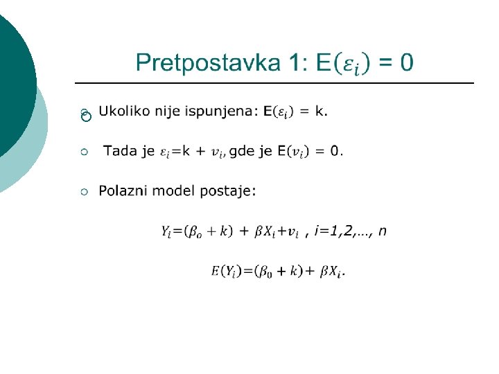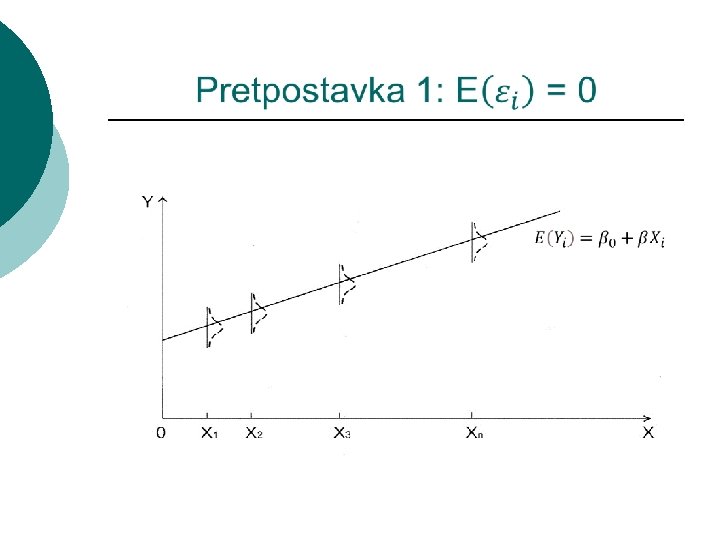 Pretpostavke klasičnog linearnog regresionog modela (KLRM) ¡ Model: ¡ Pretpostavke KNLRM/KLRM o εi : 1. 2. 3. 4. 5. E(εi)=0, za svako i. Var (εi)=E(εi 2)=σ2, za svako i. Cov(εi, εj)=E(εiεj)=0, za svako i, j, tako da i≠j. εi ~ N(0, σ2). E(εi. Xi)=0, za svako i. Odatle: Yi je slučajna promenljiva; Y~N(β 0+βXi, σ2)