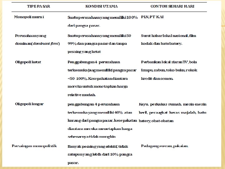 STRUCTURE = STRUKTUR Bentuk Permintaan yang dihadapi firm: q Berbentuk Garis Datar = Persaingan Sempurna q Melayani seluruh Pasar = Monopoli q Dibagi dengan firm lain : Monopolistic Ø Oligopoli Ø Entrant vs Incumbent Ø Atau Jenis Struktur Pasar (Market Structure) yang Dihadapi Firm