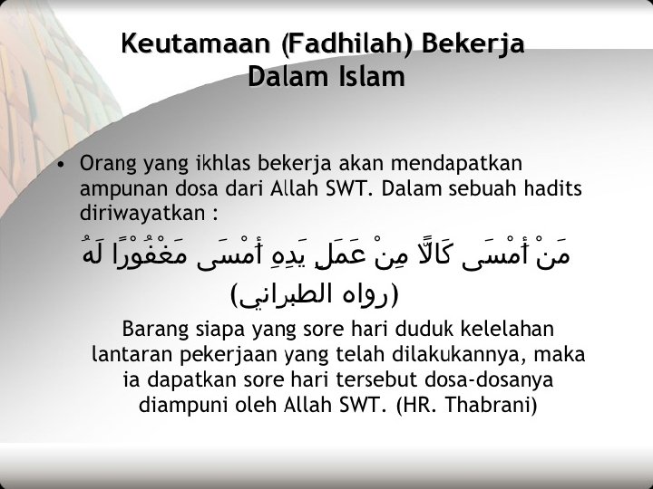 BEKERJA DALAM PANDANGAN ISLAM Bekerja merupakan suatu kewajiban karena Allah swt memerintahkannya, sebagaimana firmn-Nya ٱﻭﺍ ﻯ ٱﻠ ﻭۥ ٱﻭ ﻭ ﻯ ٱ ٱﻠ ﻡ ﺍ ﻧ ﻭ “Dan katakanlah, bekerjalah kamu, karena Allah dan Rasul. Nya serta orang-orang yang beriman akan melihat pekerjaan itu”. ( At Taubah: 105)