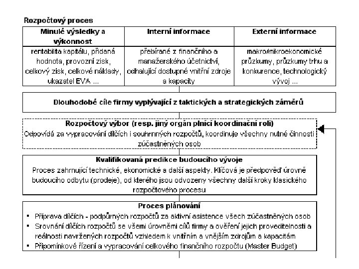 Hlavní typy finančních plánů/rozpočtů l Časové hledisko: l l l Hledisko rozsahu rozpočtů: l l krátkodobé (operativní) plány středně a dlouhodobé (strategické) plány rozpočty vnitropodnikových útvarů krátkodobý finanční rozpočet likvidity komplexní rozpočet (Master Budget) Hledisko struktury: l pevné, resp. přepočtené plány, klouzavé plány.