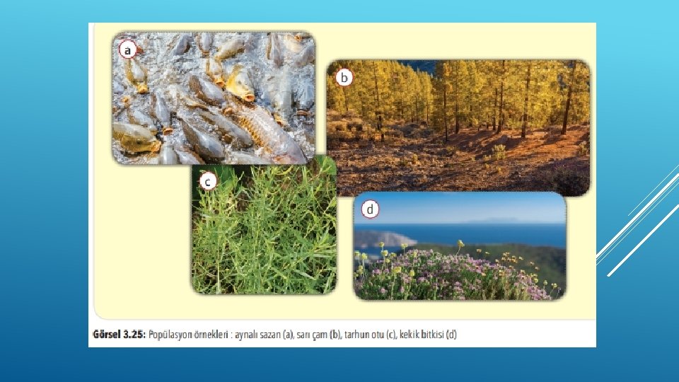 POPÜLASYON, KOMÜNITE VE EKOSISTEM : Aynı coğrafik bölgede yayılış gösteren tek bir türe ait bireylerin oluşturduğu gruplara popülasyon denir. Sapanca Gölü’nde yaşayan aynalı sazanlar (Cyprinus carpio; siprinus karpio), Sarıkamış ormanındaki sarı çamlar (Pinus sylvestris; pinus silvestris), Bayburt’ta yetişen tarhun otu (Artemisia dracunculus; artemisya dırakunkulus), Toros Dağları’nda yetişen kekik bitkisi (Thymus vulgaris; timus vulgaris) popülasyona örnektir.