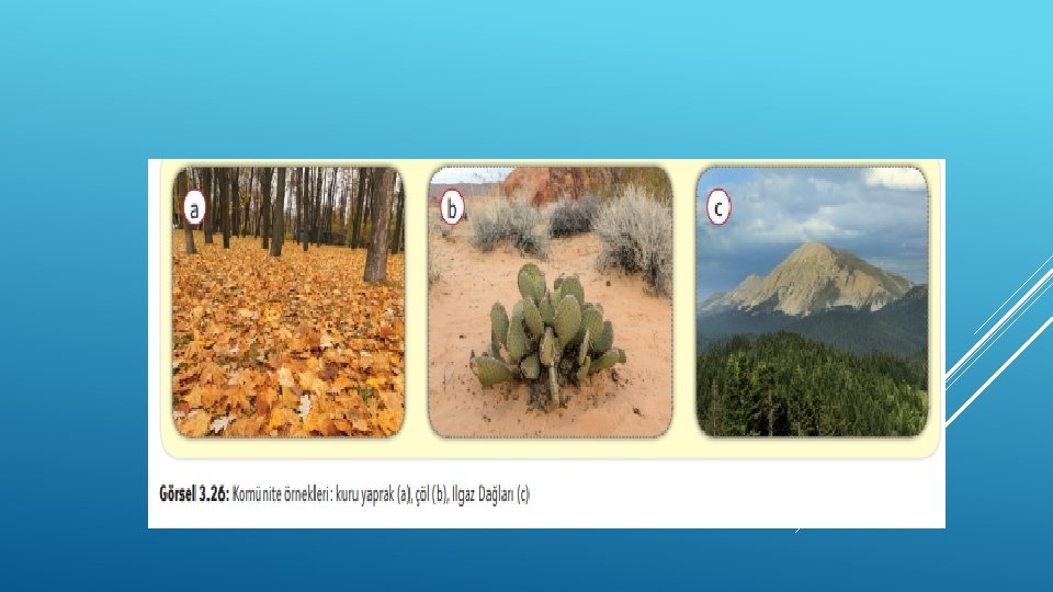 Komünitelerin büyüklükleri ve kapsamları değişiklik gösterir. Komünite, kuru yaprak üzerinde yaşamını sürdüren farklı mikroorganizma türlerinden oluşabileceği gibi Ilgaz Dağları’nda yaşayan canlı türlerinden de oluşabilir.
