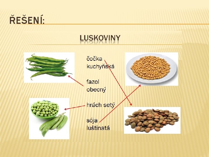 LUSKOVINY � Plodem luskoviny je lusk, ve kterém jsou semena = luštěniny. � Mezi luskoviny patří: �čočka kuchyňská �fazol obecný �hrách setý �sója luštinatá