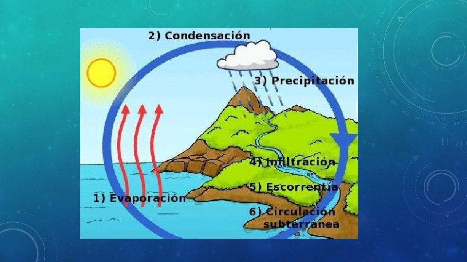 ¿CÓMO OCURRE EL CICLO DEL AGUA ? El ciclo del agua tiene una interacción constante con el ecosistema ya que los seres vivos dependen de ésta para sobrevivir, y a su vez ayudan al funcionamiento del mismo. Por su parte, el ciclo hidrológico depende de una atmósfera poco contaminada y de un grado de pureza del agua bueno, ya que de otra manera, el ciclo se entorpecería por la variación en los tiempos de evaporación o condensación. Los principales procesos implicados en el ciclo del agua son: • Evaporación: El agua se evapora en la superficie oceánica, sobre la superficie terrestre y también por los organismos, en el fenómeno de la transpiración en plantas y sudoración en animales. Los seres vivos, especialmente las plantas, contribuyen con un 10% al agua que se incorpora a la atmósfera. • Condensación: El agua en forma de vapor sube y se condensa formando las nubes, constituidas por agua en pequeñas gotas. • Precipitación: Se produce cuando las gotas de agua que forman las nubes se enfrían acelerándose la condensación y uniéndose las gotitas de agua para formar gotas mayores que terminan por precipitarse a la superficie terrestre en razón a su mayor peso. La precipitación puede ser sólida (nieve o granizo) o líquida (lluvia). • La escorrentía es el recorrido del agua sobre la corteza terrestre hasta que llega al mar • Infiltración: Ocurre cuando el agua que alcanza el suelo, penetra a través de sus poros y pasa a ser subterránea. La proporción de agua que se infiltra y la que circula en superficie (escorrentía) depende de la permeabilidad de las rocas, de la pendiente y de la cobertura vegetal. Parte del agua infiltrada vuelve a la atmósfera por evaporación o, más aún, por la transpiración de las plantas, que la extraen con sus raíces. Otra parte se incorpora a los acuíferos, niveles que contienen agua estancada o circulante. Parte del agua subterránea alcanza la superficie allí donde los acuíferos aparecen en la superficie del terreno formando fuentes naturales, pozos, o manantiales. • Escorrentía: Este término se refiere a los diversos medios por los que el agua líquida se desliza cuesta abajo por la superficie del terreno. En la mayoría de los climas y sobre todo en los llamados desérticos, la escorrentía es el principal agente geológico de erosión y de transporte de sedimentos. • Fusión: Este cambio de estado se produce cuando la nieve pasa a estado líquido al producirse el deshielo. • Solidificación: Al disminuir la temperatura en el interior de una nube por debajo de 0° C, el vapor de agua o el agua misma se congelan, precipitándose en forma de nieve o granizo, siendo la principal diferencia entre los dos conceptos que en el caso de la nieve se trata de una solidificación del agua de la nube que se presenta por lo general a baja altura. Al irse congelando la humedad y las pequeñas gotas de agua de la nube, se forman copos de nieve, cristales de hielo que adoptan numerosas formas visibles al microscopio, mientras que en el caso del granizo, es el ascenso rápido de las gotas de agua que forman una nube lo que da origen a la formación de hielo, el cual va formando el granizo y aumentando de tamaño con ese ascenso.